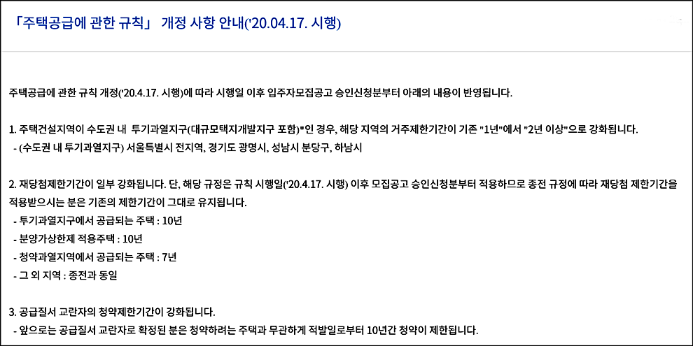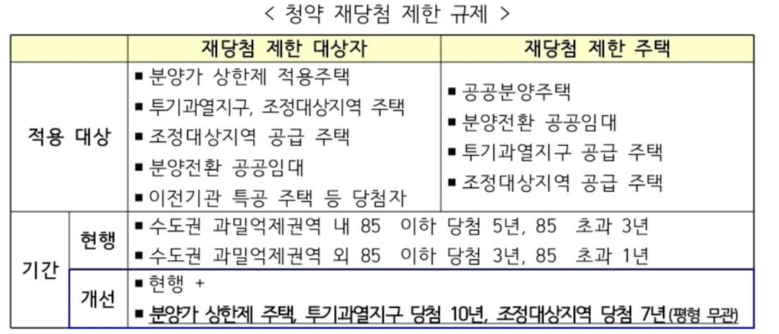 분양가 상한제 주택과 투기과열지구 내 주택당첨자는 주택의 크기와 상관없이 10년, 조정대상 지역 주택 당첨자는 7년 으로 재당첨제한 기간이 강화 되었습니다.