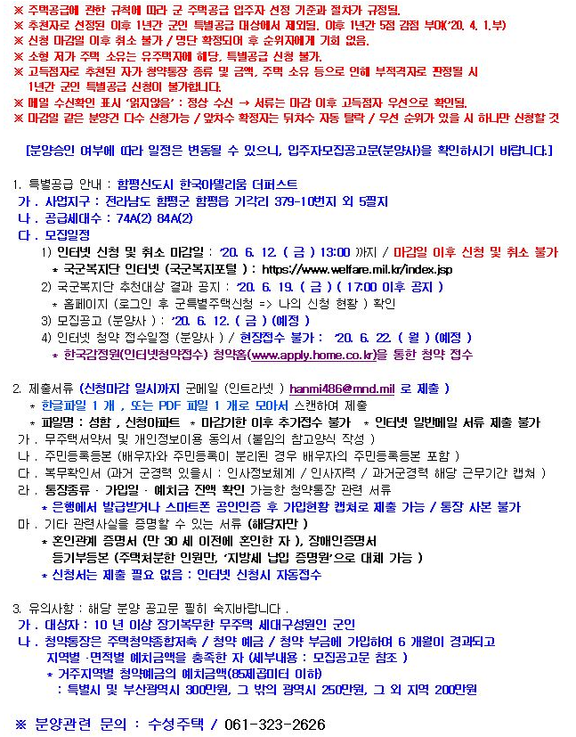 * 특별공급요건과 1순위 요건은 다르므로 1순위 지원시 자격요건은 별도 확인하시기 바랍니다.(일반공급시 전남 함평은 거주요건 없음)