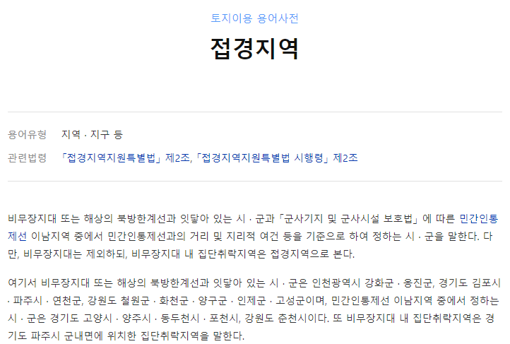 접경지역은 대표적으로 인천의 강화군, 옹진군, 경기도 김포, 파주, 연천, 고양, 양주, 동두천, 포천 그리고 강원도에서는 춘천, 철원, 화천, 양구, 인제, 고성 등이 있습니다.