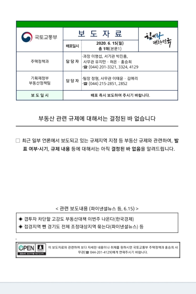 급기야 정부는 지난 6월 15일 오후에 공식보도자료를 통해서 부동산과 관련된 규제에 대해서 결정된 바가 없다며 논란을 일축하고 있는데요, 그러나 과거에 이런 보도자료가 나오면 반드시 규제책이 나온것을 고려해본다면.. 아마 무언가 나오긴 나올 것 같습니다.