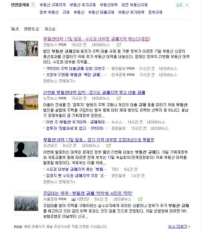 이에 언론도 마치 확정된 내용인 것처럼 다양한 내용들을 언급하며 21번째 부동산대책에 대해서 많은 언급이 있었습니다. 아래는 네이버에 연관검색어와 주요 기사들의 헤드라인입니다.