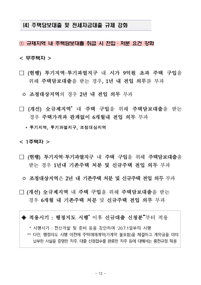 투기지역 및투기과열지구내 시가 9억원 초과 주택구입을 위한 주택담보대출 시 1년내 전입의무 / 조정대상지역은 2년 내 전입의무 -> 규제지역내 주택은 주택가격과 상관없이 6개월 내 전입의무