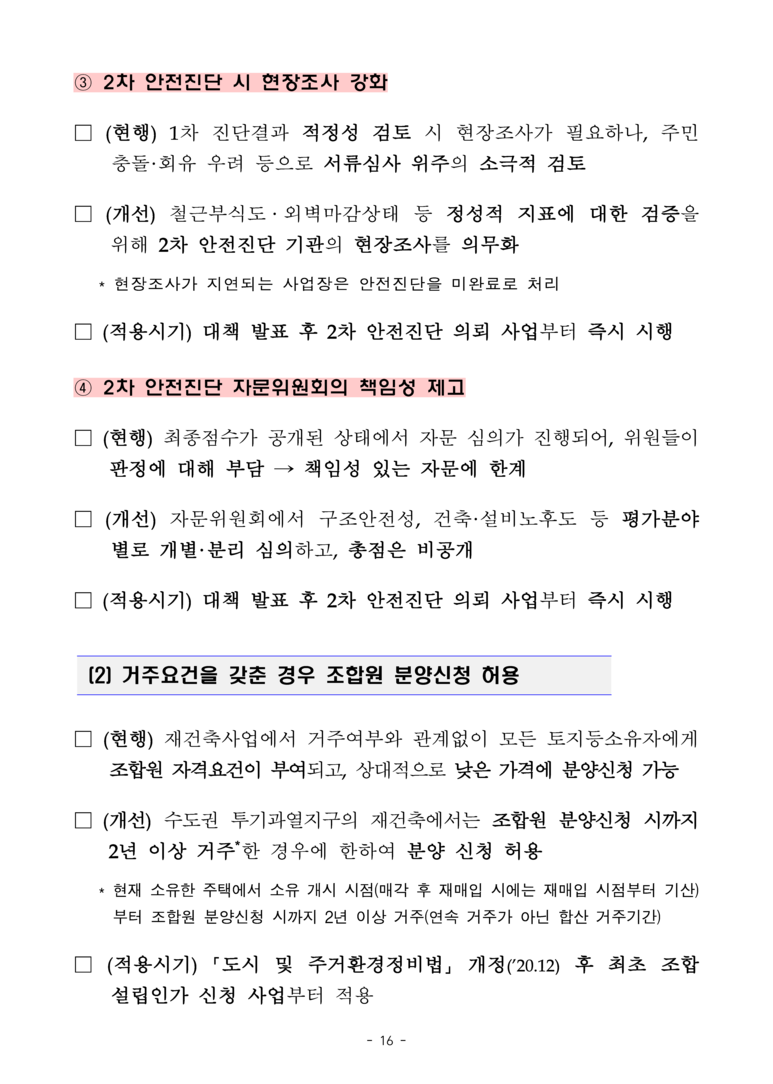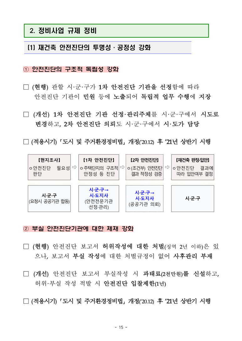(2)부실 안전진단 기관에 대한 제재 강화 : 과태료(2천만원) 및 안전진단 입찰제한(1년) 강화