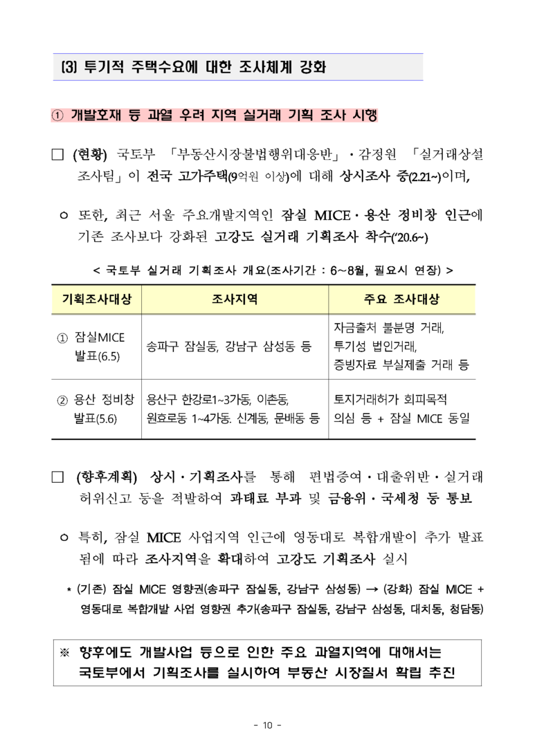 (1)고가주택 9억원 이상 주택에 대해 상시조사 중(2.21이후)이며 국토부 실거래 기획조사 6~8월 간 실시예정