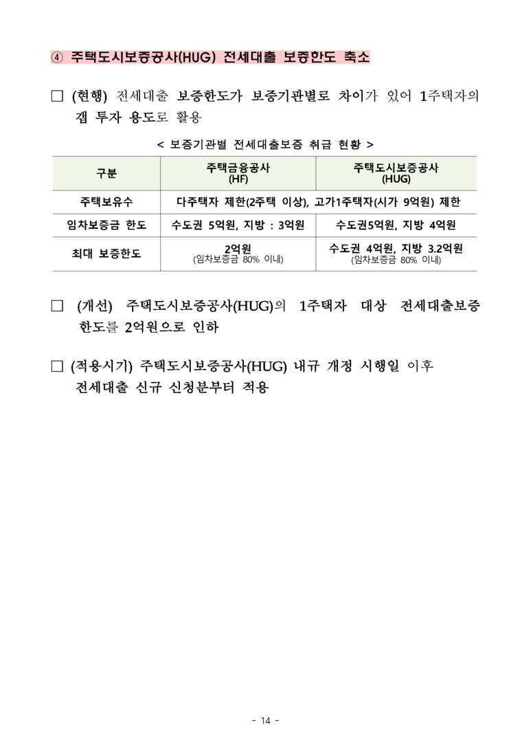 (3) 주택도시보증공사(HUG) 전세대출 보증한도를 1주택자는전세대출 보증한도를 2억원으로 인하