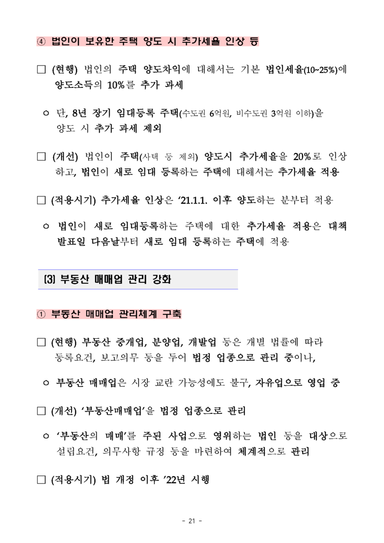 (5)법인이 보유한 주택 양도시 추가세율 인상 : 현행 10%에서 20%로 인상하고, 새로 임대하는 주택(8년 장기임대 등록 주택 : 수도권6억, 비수도권 3억 이하)에 대해서는 추가세율을 적용