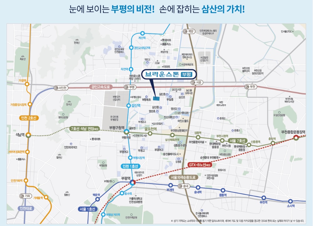 (1) 입지 : 인천 부평구의 중심은 아니고 갈산역 인근이나 입지는 보통입니다. 주변 구축이 많아 신축수요는 있어보입니다. 삼산1구역 재개발지역입니다.