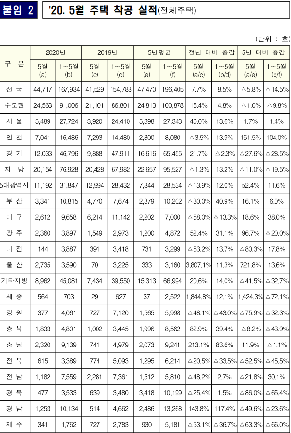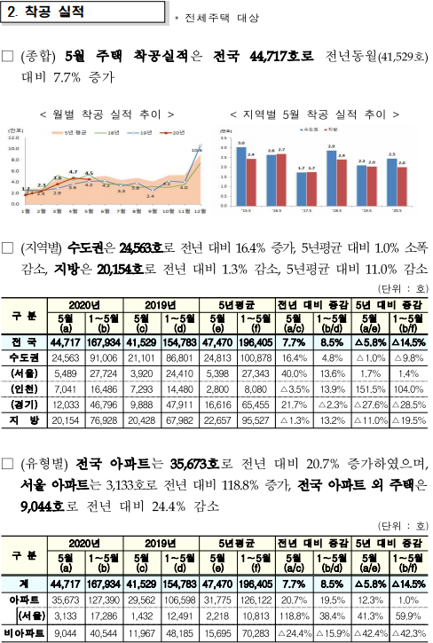 (종합) 5월 주택 착공실적은 전국 44,717호로 전년동월(41,529호) 대비 7.7% 증가하였습니다.