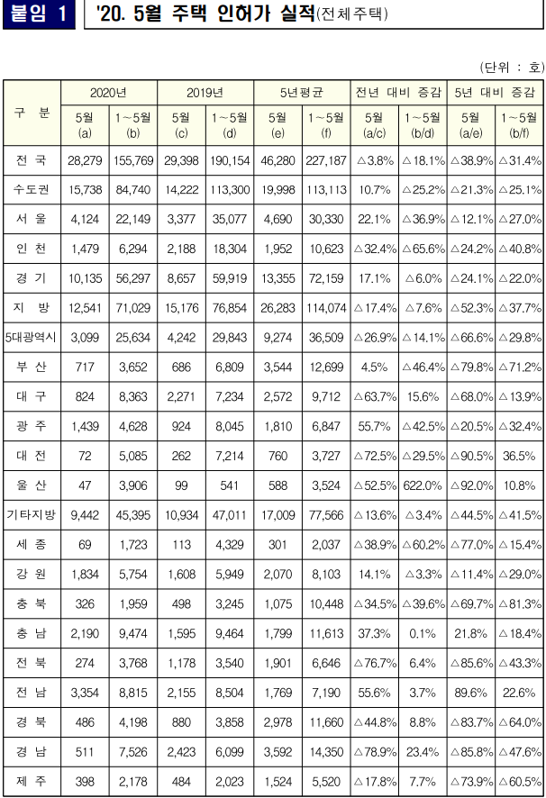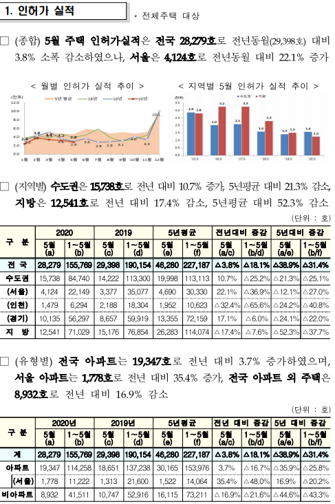 (종합) 5월 주택 인허가실적은 전국 28,279호로 전년동월(29,398호) 대비 3.8% 소폭 감소하였으나, 서울은 4,124호로 전년동월 대비 22.1% 증가하였습니다.