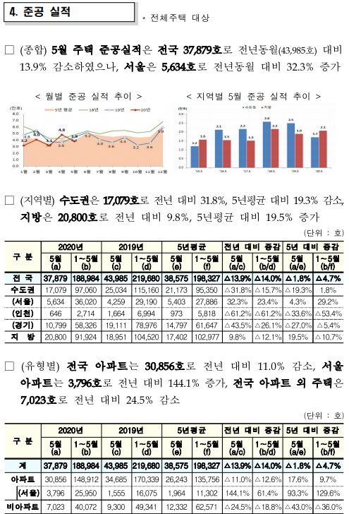 (종합) 5월 주택 준공실적은 전국 37,879호로 전년동월(43,985호) 대비 13.9% 감소하였으나, 서울은 5,634호로 전년동월 대비 32.3% 증가하였습니다.