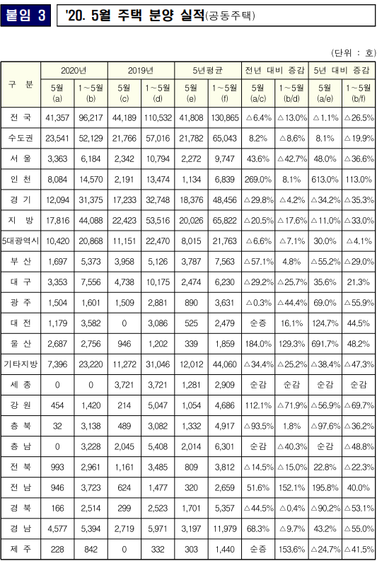 (종합) 5월 공동주택 분양실적은 전국 41,357호로 전년동월(44,189호) 대비 6.4% 감소하였습니다.