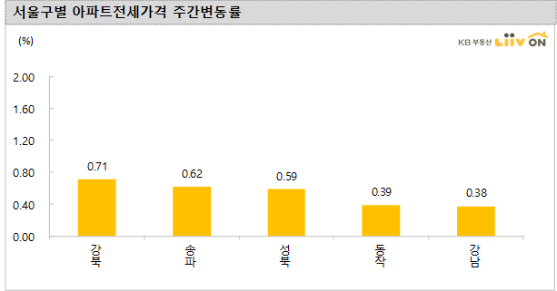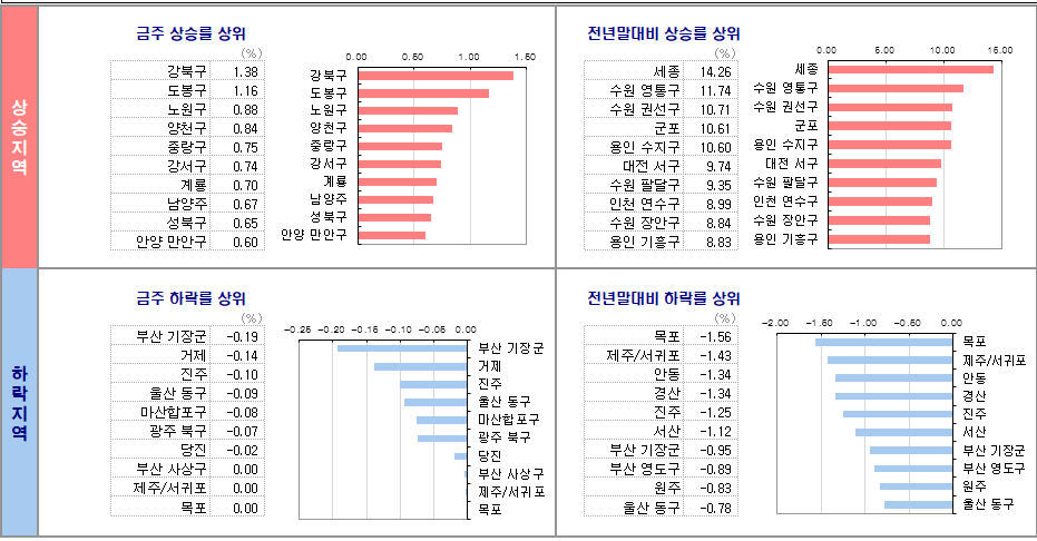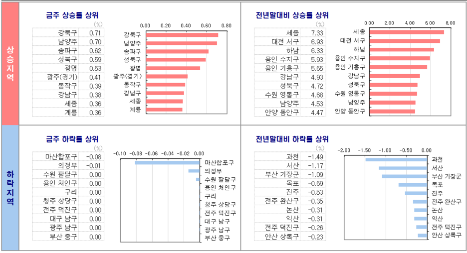 -서울(0.26%)은 전주대비 상승을 기록했다. 강북구(0.71%), 송파구(0.62%), 성북구(0.59%), 동작구(0.39%), 강남구(0.38%)의 상승이 높고, 하락 지역 없이 다수의 지역에서 상승했다.