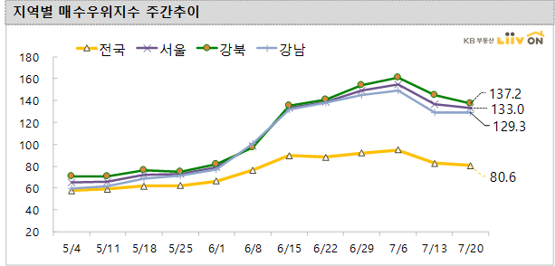 강북지역은 지난주(145.3)보다 하락한 137.2를 기록했고, 강남지역은 지난주 128.8에서 129.3으로 유사하다. 전국 매수우위지수는 80.6을 기록해 지난주(82.6)보다 하락했다.