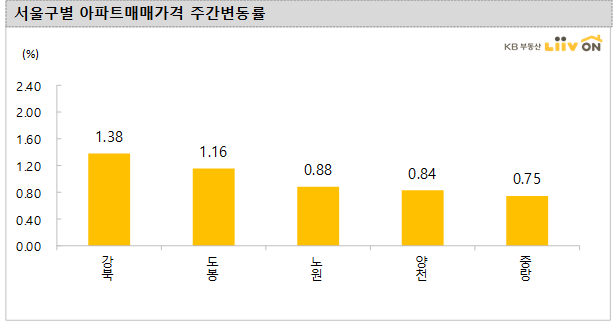 -서울 아파트 매매가격은 지난주에 이어서 이번주에도 전 지역 상승을 보였다. 강북구(1.38%), 도봉구(1.16%), 노원구(0.88%), 양천구(0.84%) 등 높은 상승을 보였다.
