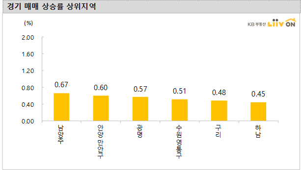 -경기는 전주대비 0.29%의 변동률을 기록하면서 지난주 상승폭(0.35%)보다는 둔화됐다. 남양주(0.67%), 안양 만안구(0.60%), 광명(0.57%), 수원 영통구(0.51%), 구리(0.48%)가 강세를 보였고, 하락 지역은 없다.