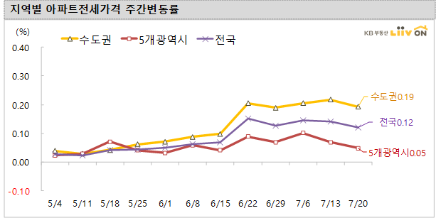 전국 아파트 전세가격은 전주대비 0.12%의 상승을 기록했다. 수도권(0.19%)과 5개 광역시(0.05%), 기타 지방(0.04%)은 전주대비 상승했다.
