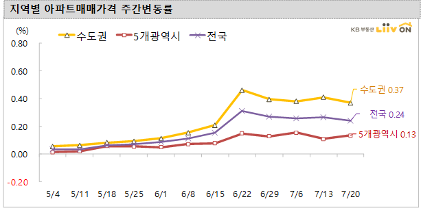 오늘은 7월 20일 기준 KB부동산 주간 아파트 가격동향을 살펴보겠습니다.