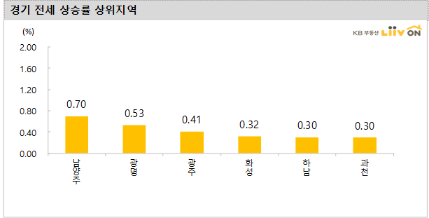 -경기도 아파트 전세가격 변동률은 전주 대비 0.19%로 상승했고, 인천(0.03%)은 소폭의 상승을 보였다. 남양주(0.70%), 광명(0.53%), 광주(0.41%), 화성(0.32%)이 상승했다. 하락 지역은 없다.