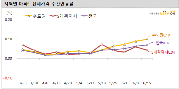 전국 아파트 전세가격은 전주대비 0.07%의 상승을 기록했다. 수도권(0.10%)과 5개 광역시(0.04%), 기타 지방(0.03%)은 전주대비 상승했습니다.