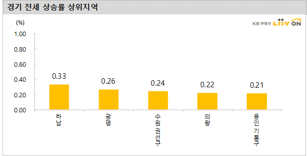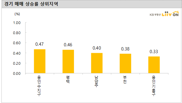 -경기는 전주대비 0.22%의 변동률을 기록하면서 지난주 상승폭(0.17%)보다 확대됐습니다. 용인 수지구(0.47%), 평택(0.46%), 남양주(0.40%), 부천(0.38%), 용인 기흥구(0.33%)가 강세를 보였고, 하락 지역은 없습니다.