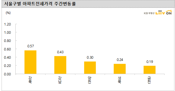 강북구는 부동산 대출규제로 매입 자금 마련에 어려움을 겪고 있어 매매로 전환하는 수요가 줄고, 전세 매물은 월세 전환 등으로 갈수록 줄어들고 있어 수요에 비해 물건이 부족합니다. 그로 인해 거래량이 많지 않음에도 불구하고 전세가 강세를 보이고 있습니다.