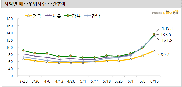 서울은 133.5로 지난주(98.7)보다 폭발적으로 상승했다. 강북지역은 지난주(96.6)보다 상승한 135.3을 기록했고, 강남지역은 지난주 100.2에서 131.8로 급 상승하면서 매수문의가 코로나 이전보다 더 높은 수준으로 증가했습니다.