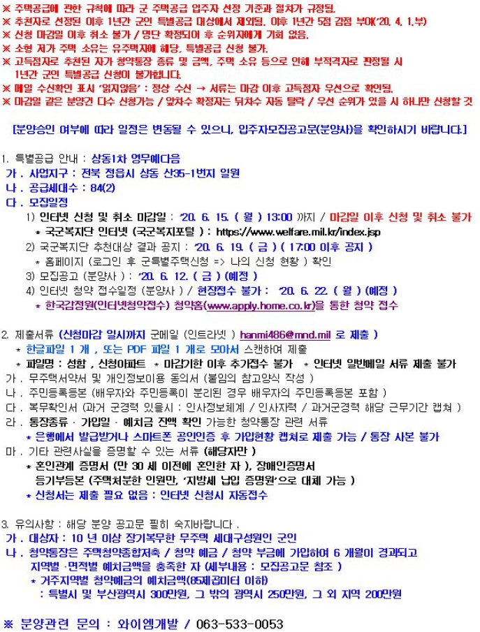 (2) 특별공급요건 : 10년이상 장기복무 무주택 세대구성원 및 군인 / 청약 6개월 경과 / 지역, 면적 예치금충족(전북 200만원)