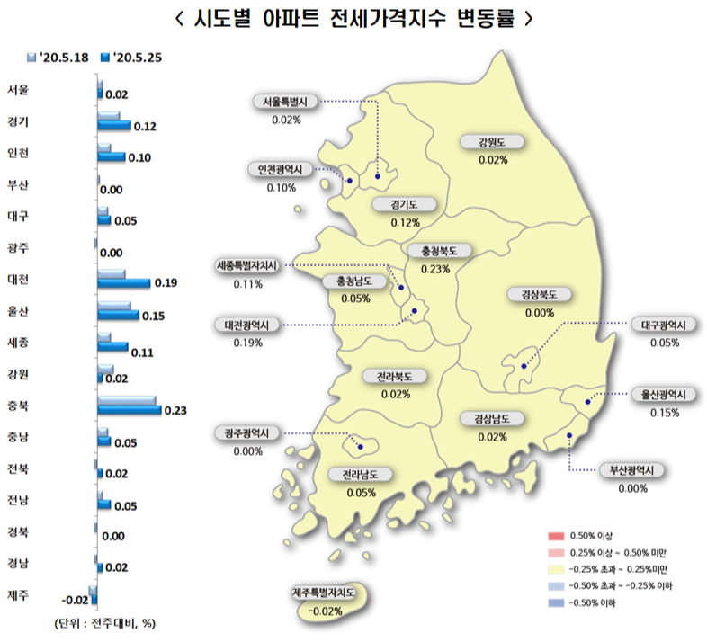 - 세종(0.24%->0.28%)은 상승폭이 확대되었습니다. BRT 노선 추가 기대감 있는 고운동과 그간 상승폭 적었던 행복도시 외곽 조치원읍과 금남면에서 오름세 보이며 상승했습니다.