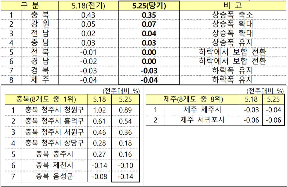 - 그 외 8개도(0.04%->0.05%)는 소폭 상승했습니다. 특히, 청주시 청원구(0.89%)는 방사광 가속기 호재, 흥덕(0.54%)은 테크노폴리스 개발 기대감 등으로 상승세가 지속되고 있습니다.