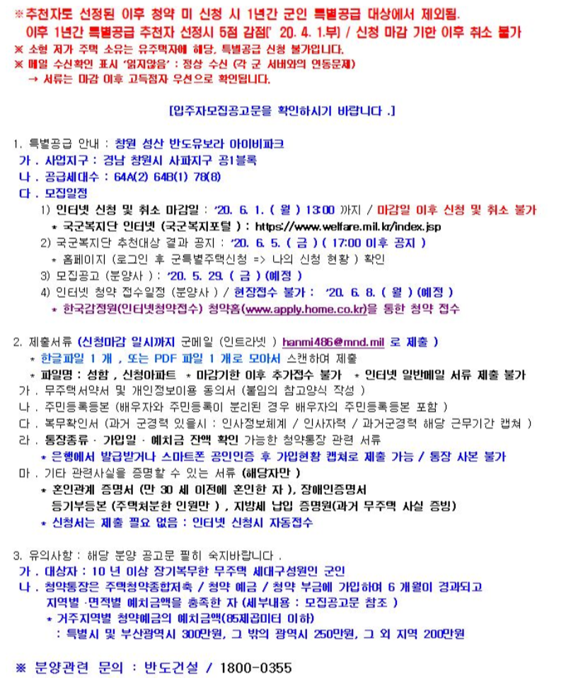 (2) 특별공급요건 : 10년이상 장기복무 무주택 세대구성원 및 군인 / 청약 6개월 경과 / 지역, 면적 예치금충족(경남 200만원)