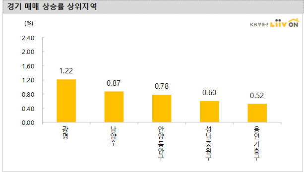 -경기는 전주대비 0.35%의 변동률을 기록하면서 지난주 상승폭(0.33%)과 유사하다. 광명(1.22%), 남양주(0.87%), 안양 동안구(0.78%), 성남 중원구(0.60%), 용인 기흥구(0.52%)가 강세를 보였고, 하락 지역은 없다.