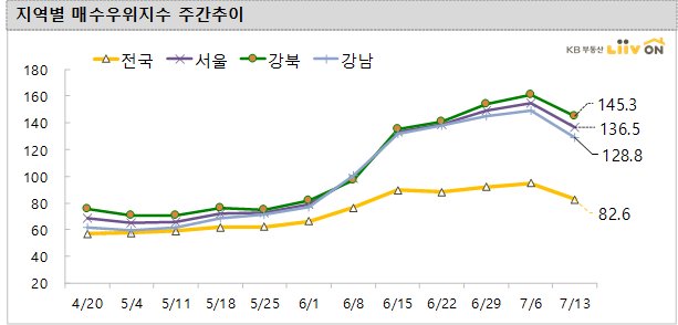 서울의 매수우위지수는 136.5로 지난주(154.5)보다 하락했다. 강북지역은 지난주(160.8)보다 하락한 145.3을 기록했고, 강남지역은 지난주 149.0에서 128.8로 하락했다. 전국 매수우위지수는 82.6을 기록해 지난주(94.7)보다 하락했다.