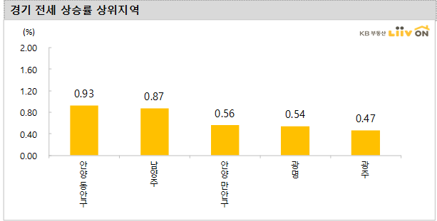 -경기도 아파트 전세가격 변동률은 전주 대비 0.23%로 상승했고, 인천(0.01%)은 보합에 가까운 미미한 상승을 보였다. 안양 동안구(0.93%), 남양주(0.87%), 안양 만안구(0.56%), 광명(0.54%)가 상승했다. 하락 지역은 없다,
