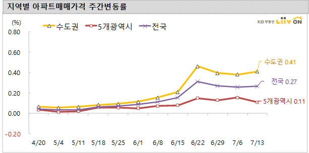 서울은 전주대비 0.27%을 기록했고, 경기(0.23%)도 전주대비 상승했다. 5개 광역시에서는 대구(0.13%), 대전(0.10%), 울산(0.07%), 광주(0.06%), 부산(0.01%) 모두 상승했다.
