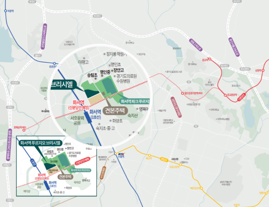 (1) 입지 : 화서역 푸르지오 브리시엘은 수원내 당연 최고의 입지라고 할 수있겠습니다. 화서역이 신분당선개통 뿐만아니라 주변 개발계획이 많습니다.