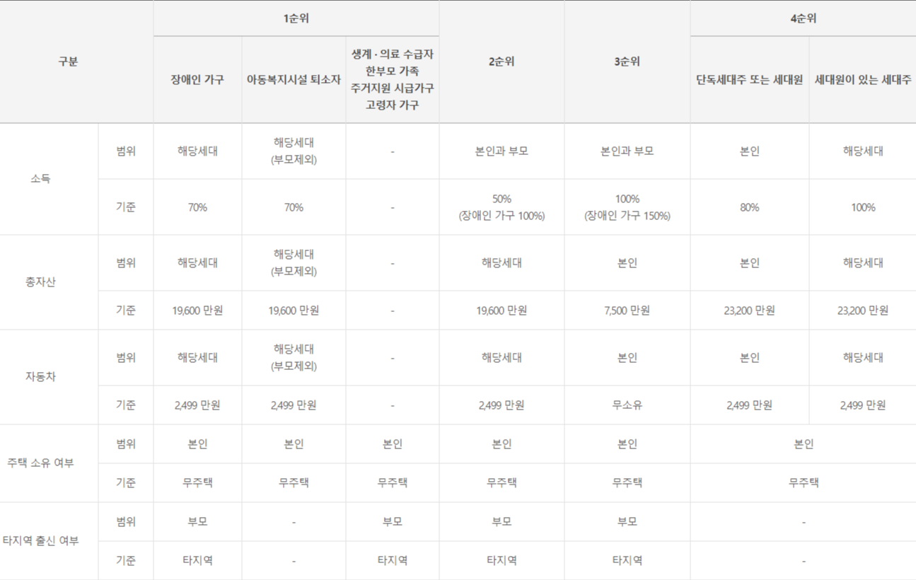 - (자산기준) 보유 부동산(건물+토지), 자동차의 가액이 기준금액 이하인 자