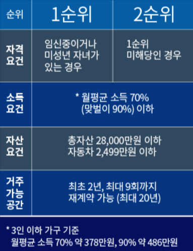 무주택 요건 및 소득·자산기준을 충족하는 신혼부부, 예비 신혼부부, 한부모가족(신혼부부 : 혼인기간 7년 이내 또는 예비 신혼부부인 무주택 세대 / 한부모가족 : 만 6세 이하 자녀를 둔 모자 또는 부자가족)을 대상으로 합니다.