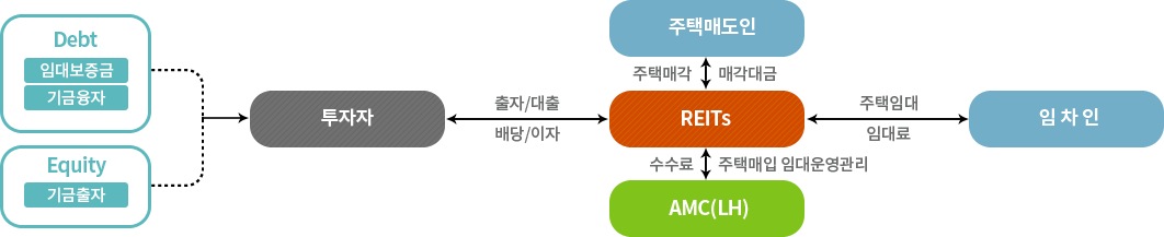 주거부담이 큰 월세 거주비율이 높은 청년·신혼부부를 대상으로 주택도시 기금이 리츠를 설립하여 임차인 보증금과 기금을 통해 기존 주택을 매입한 후, LH가 시세의 90% 이하로 공급하는 임대주택입니다.