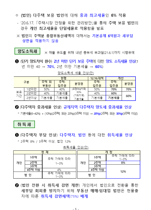 * 기본세율(6~42%) + 10%(2주택) 또는 20%(3주택이상) -> 20% 또는 30% 인상