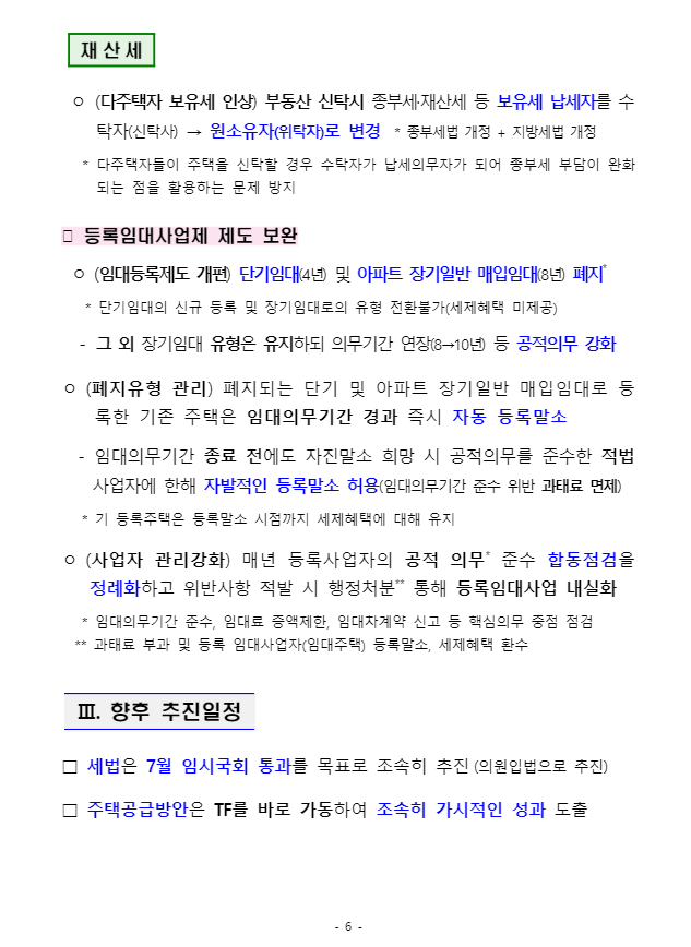 특히, 신탁을 통한 부담완화를 막고, 등록임대사업자 혜택과 등록을 축소하여 시장에 물건이 나오게끔 유도한 듯보입니다.