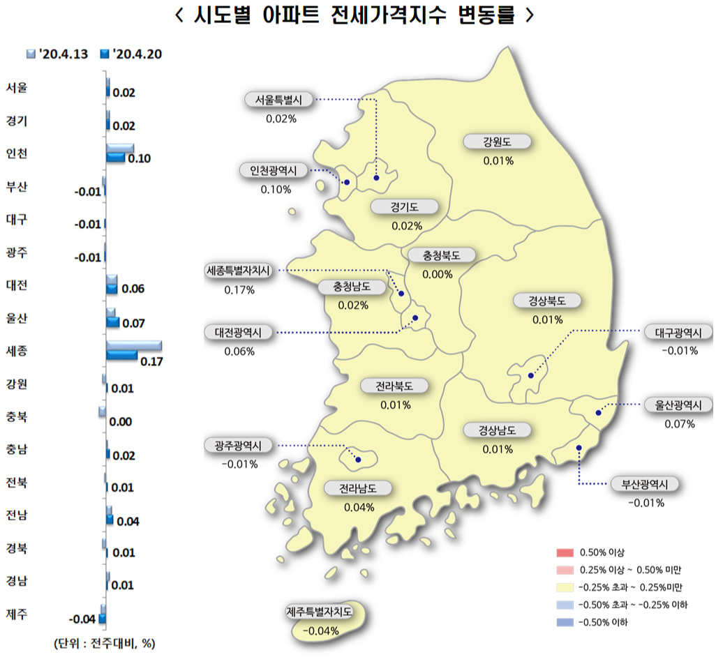 - 세종(0.30%->0.17%)은 상승폭이 축소되었습니다. 충남대병원 개원 영향 및 교통여건 양호한 도담동 위주로 상승했으나, 코로나 확산에 따른 사회적 거리두기 등으로 거래활동이 위축되며 전체적으로 지난주 대비 상승폭이 축소되었습니다.