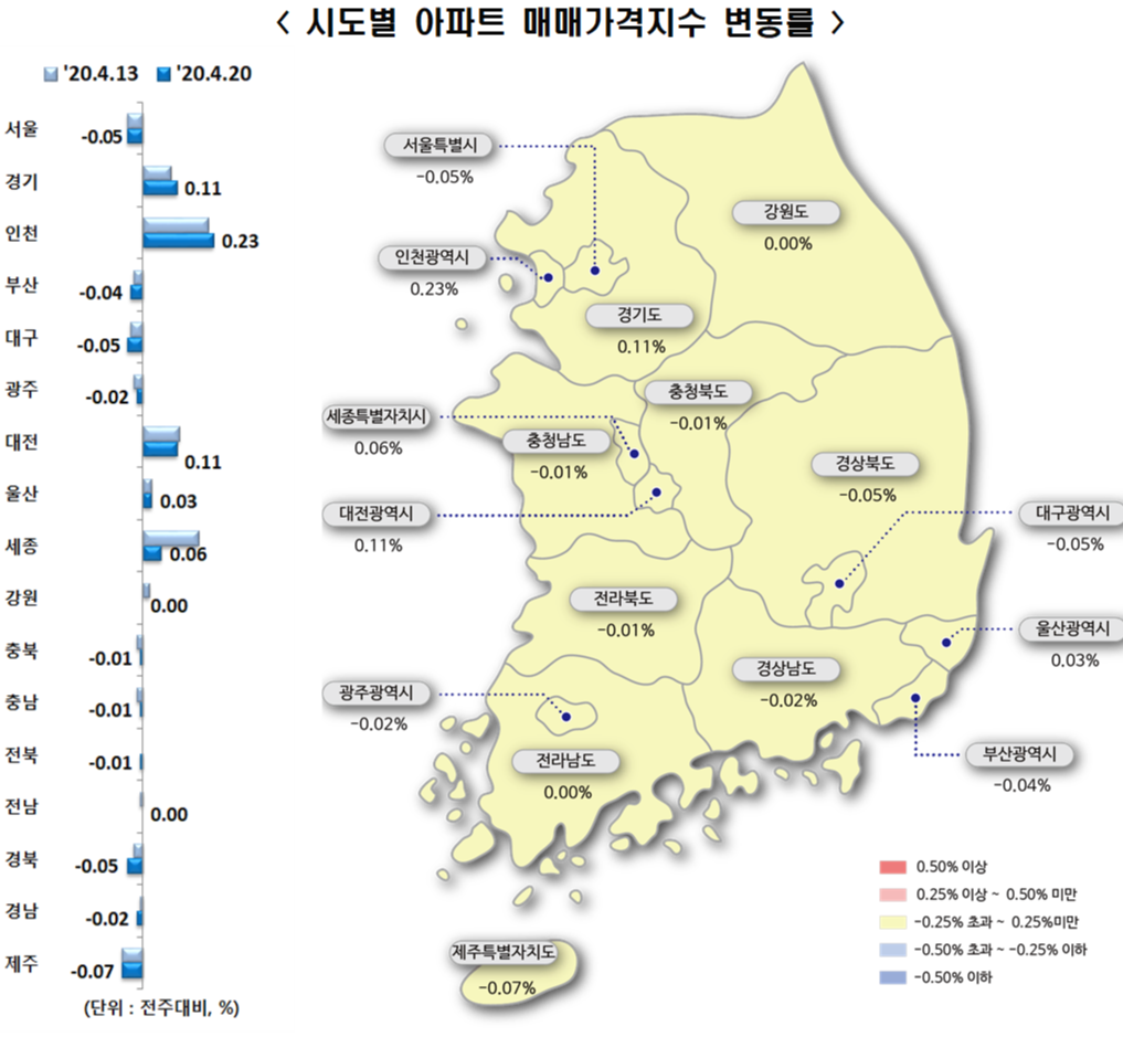 - 서울(-0.05%->-0.05%)은 제 21대 총선(4.15) 결과에 따른 안정화정책 기조 유지 예상 및 코로나19로 인한 경제지표 악화 등으로 관망세를 보이는 가운데, 재건축 및 고가다닞 위주로 4주 연속 하락세를 보이고 있습니다.