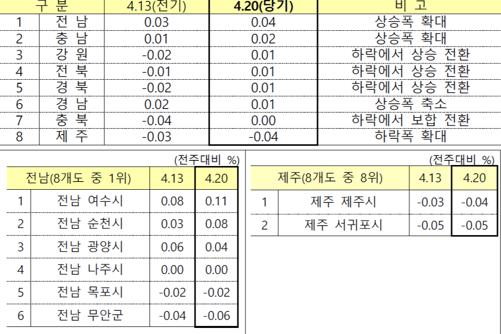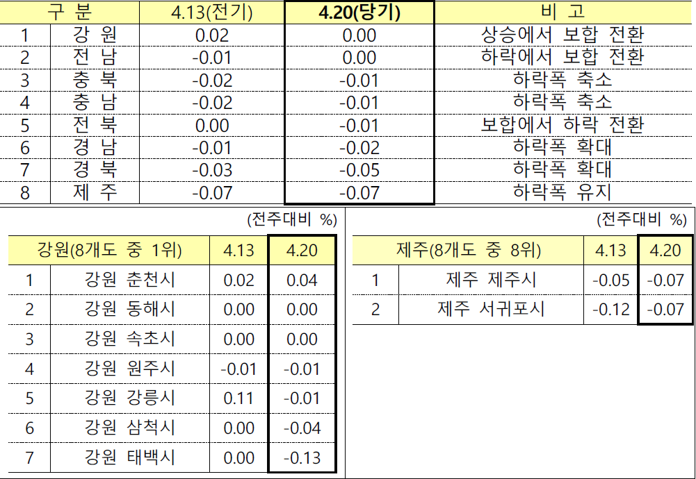 - 그 외 8개도(-0.01%->-0.02%)는 하락폭이 확대되었습니다.