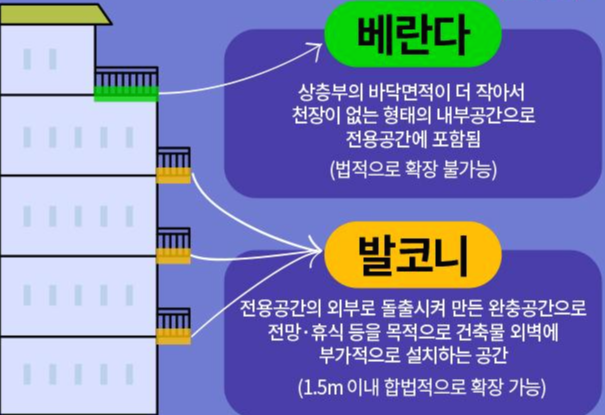 우리가 흔히 부르는 발코니는 건축물 위의 내부, 외부를 연결하는 별도의 완충공간으로 전망, 휴식 등의 목적을 위하여 건축물 외벽에 추가로 설치하는 공간입니다.