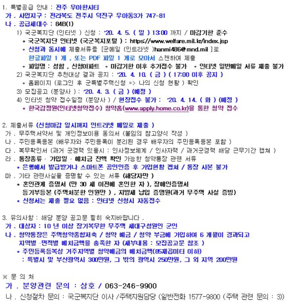 (2) 특별공급 요건 : 10년 이상 장기복무 무주택 세대 구성원 및 군인 / 청약 6개월 경과 / 지역, 면적 예치금 충족(전북 전주 200만 원)