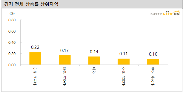 - 경기도 아파트 전세 가격 변동률은 전주 대비 0.04%로 상승했고, 인천도 전주 대비 상승(0.12%)을 나타냈습니다. 수원 권선구(0.22%), 용인 기흥구(0.17%), 오산(0.14%), 수원 장안구(0.11%) 등이 상승을 보였습니다. 다만, 과천(-0.71%)이 다소 큰 폭으로 하락했는데요,