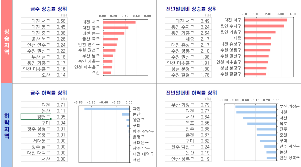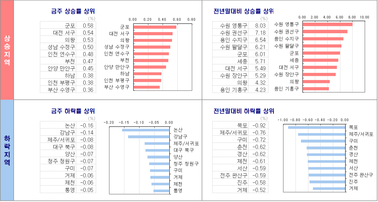 - 인천(0.12%)은 연수구(0.24%), 미추홀 구(0.16%)가 상승을 보였습니다.