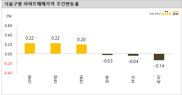 - 서울 아파트 매매 가격은전주 대비 0.06%로 지난주의 상승 0.12%보다 상승세가 크게 둔화되면서 보합권에 진입했습니다. 특히, 강남구(-0.14%), 서초구(-0.04%), 송파구(-0.03%) 강남3구 모두 마이너스를 보였고, 다수의 지역이 보합권에 가까운 정체를 보였습니다. 다만, 광진구(0.22%), 양천구(0.22%), 금천구(0.20%) 등 일부 지역만 소폭 상승했습니다.