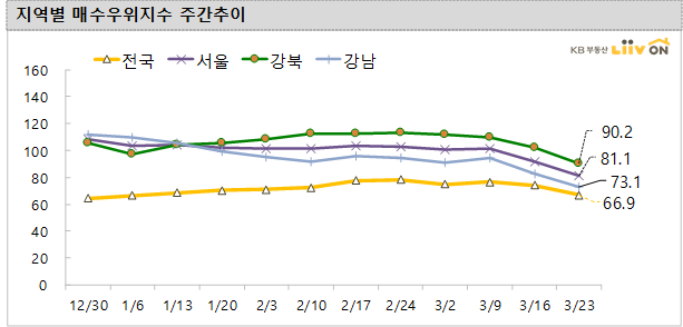 전국 매수우위 지수는 66.9를 기록해 전주(74.3) 대비 크게 하락했습니다. 코로나 사태로 인해 시장에서 매수에 대한 문의도 위축된 것으로 보입니다. 서울도 81.1로 전주(91.8) 대비 크게 하락했는데요, 강남지역은 지난주 82.8에서 73.1로 하락했고, 강북지역도 지난주(102.0) 대비 하락한 90.2를 기록하며 매수문의가 대폭 줄어들었습니다.