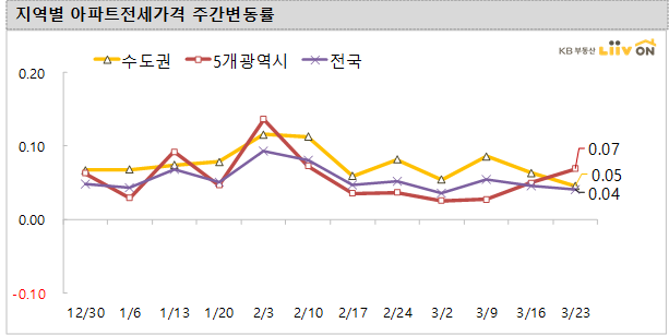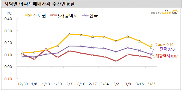 3월 23일 전국적으로 상승폭이 둔화되었습니다. 인천(0.28%)과 경기(0.20%), 서울(0.06%)은 상승폭이 지난주보다 줄어들었고, 인천을 제외한 5개 광역시(0.07%)는 대전(0.29%)만 다소 높은 편이고, 울산(0.06%), 부산(0.05%), 대구(0.03%)는 소폭 상승했고 광주(0.00%)는 보합을 보였습니다.